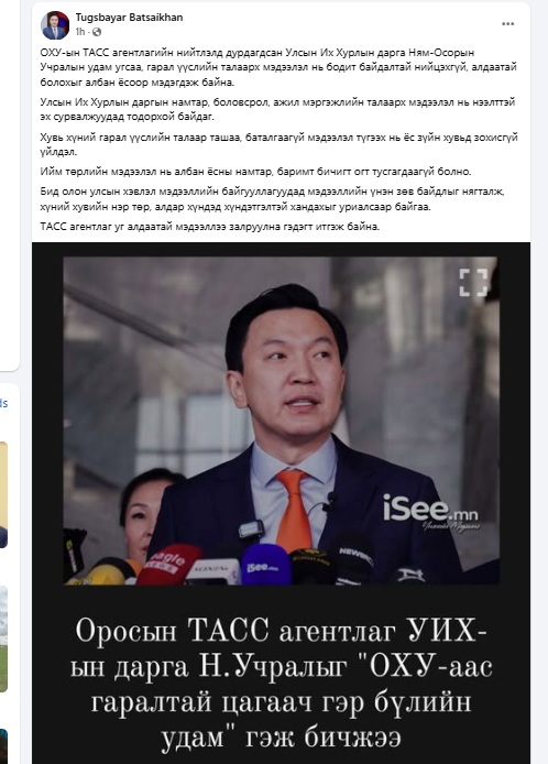 УИХ-ын дарга Н.Учрал ОХУ-д айлчилж байгаа билээ. Гэтэл ОХУ-ын ТАСС агентлагийн мэдээнд УИХ-ын дарга Н.Учралыг “ОХУ-аас Монголд цагаачилж очсон цагаач гэр бүлийн удам” хэмээн бичжээ.